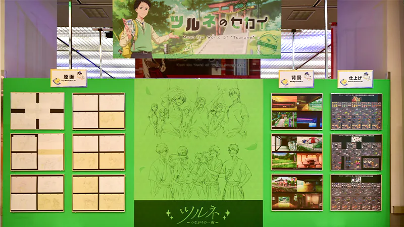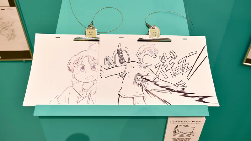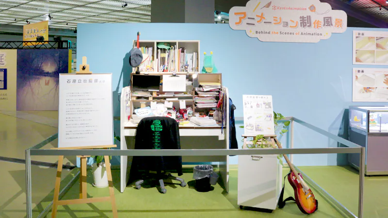 展示エリア入口ではイベントキービジュアルを使用した「ウェルカムボード」やラフイラスト等の制作資料などがお出迎え。石原立也監督が実際に使用している作画机も展示され、スタジオの雰囲気をそのままお届けしたような一画となりました。