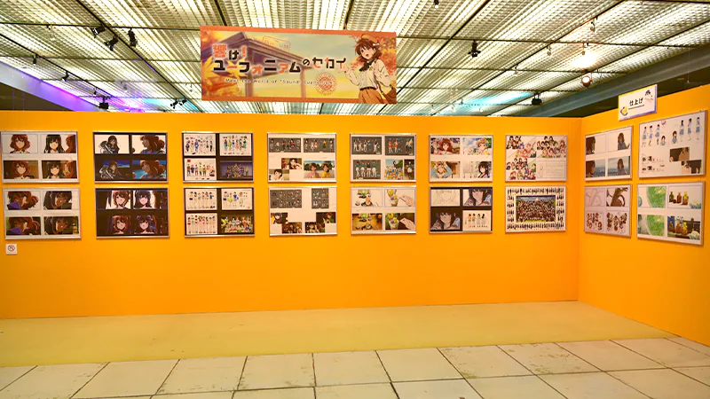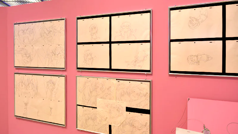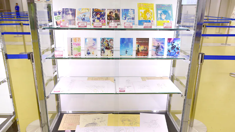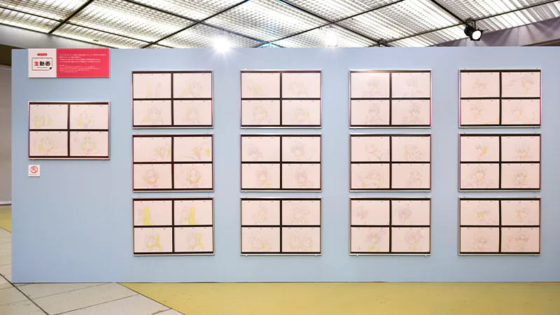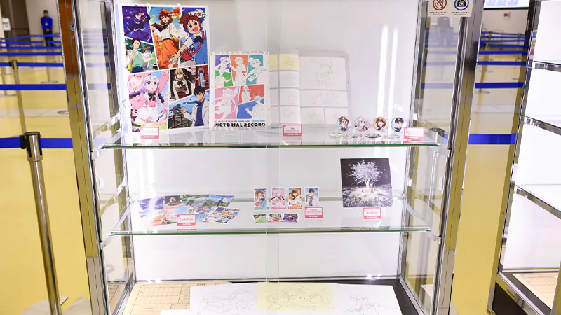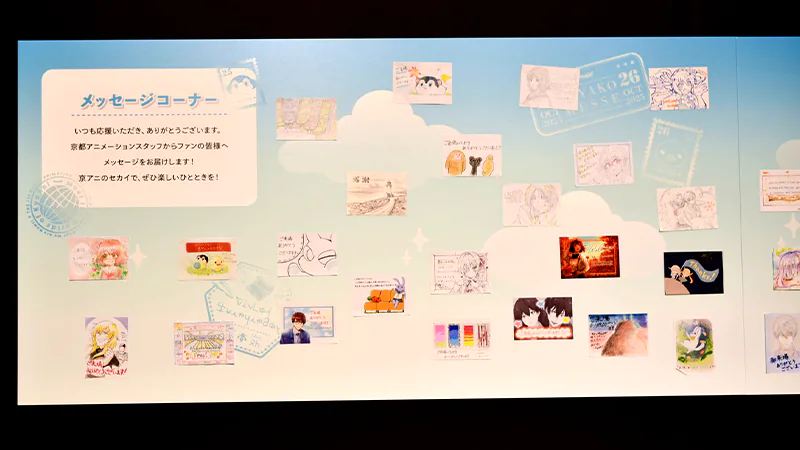 制作資料の展示のほか、京アニスタッフからご来場者さまへ感謝の気持ちを届ける「スタッフメッセージボード」(1F)、アニメーターによる手描き商品「生動画」の一挙展示(1F)、各作品の「絵コンテコーナー」(1F)、40体以上にのぼる「スタンディパネル展示」(B1)、これまでの京アニ作品の歴史をたどる「歴代ポスター大集結」(B1)などの展示が行われました。