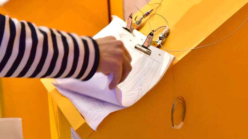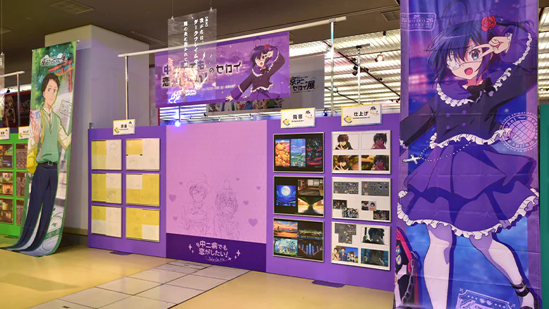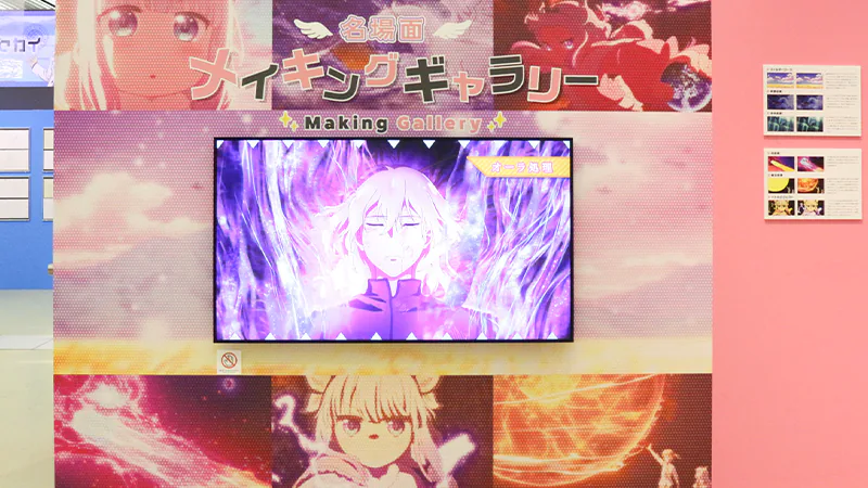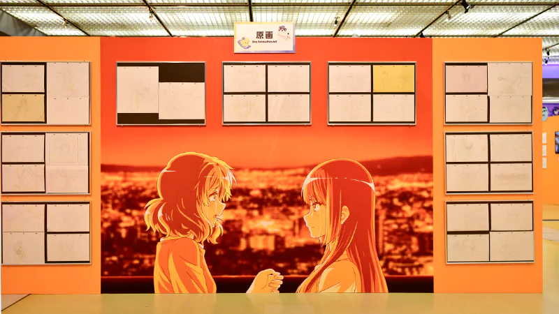 1F展示エリアでは原画・動画から背景・仕上げ・CG・撮影に至るまで、1,000点を超える制作資料をパネル展示。巨大タペストリーや、天井から吊り下げられた名セリフたちも会場を彩りました。動画(複製)を実際にめくって楽しめる「パラパラ動画」コーナーや、映像やパネルで京アニの画作りを解説する「メイキングギャラリー」、様々なイラストのメイキングを特別ムービーとして編集した「メモリアルギャラリー」など、大ボリュームの展示によって、京都アニメーションが作品に込めた情熱を余すことなくお伝えしました。