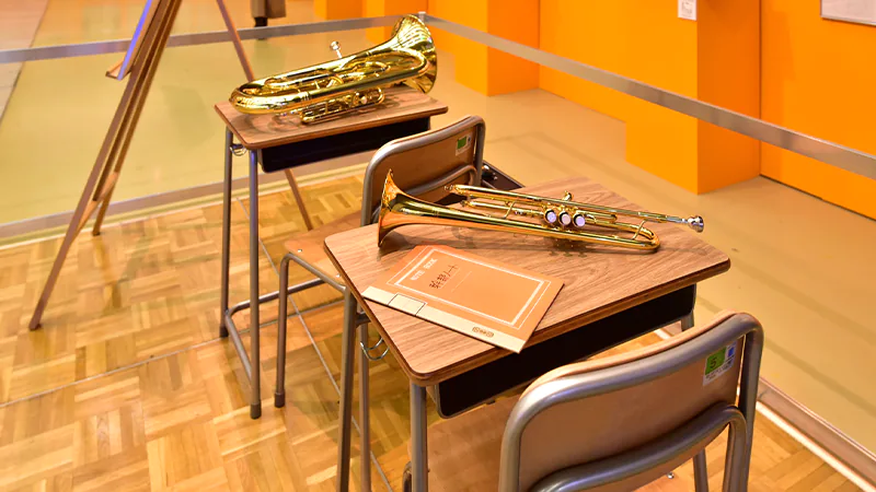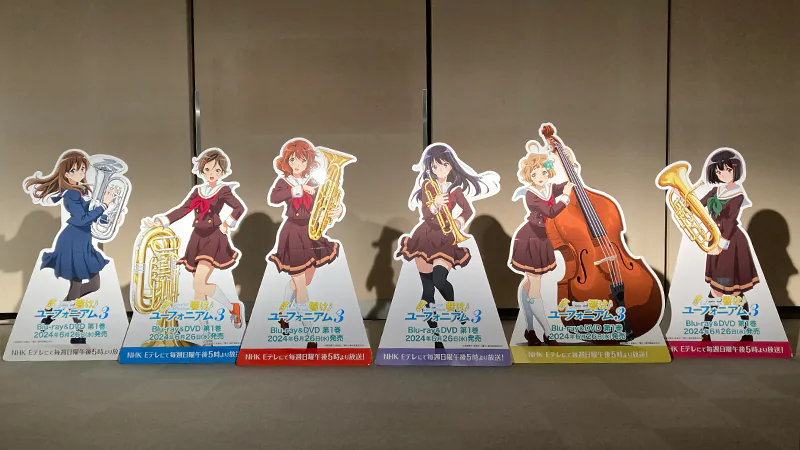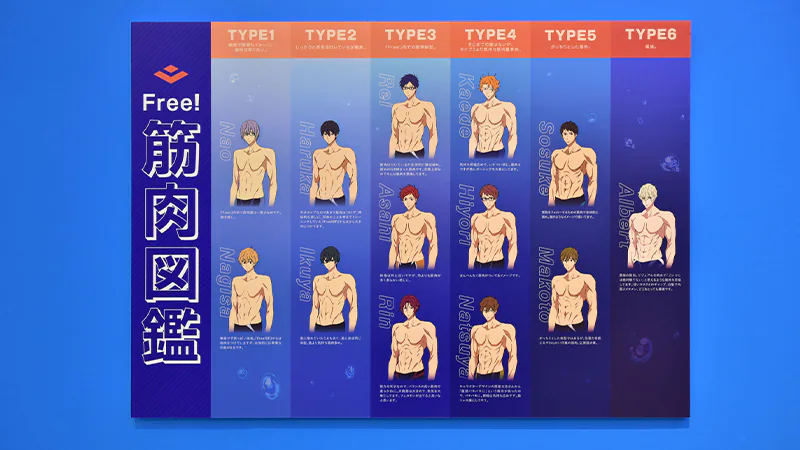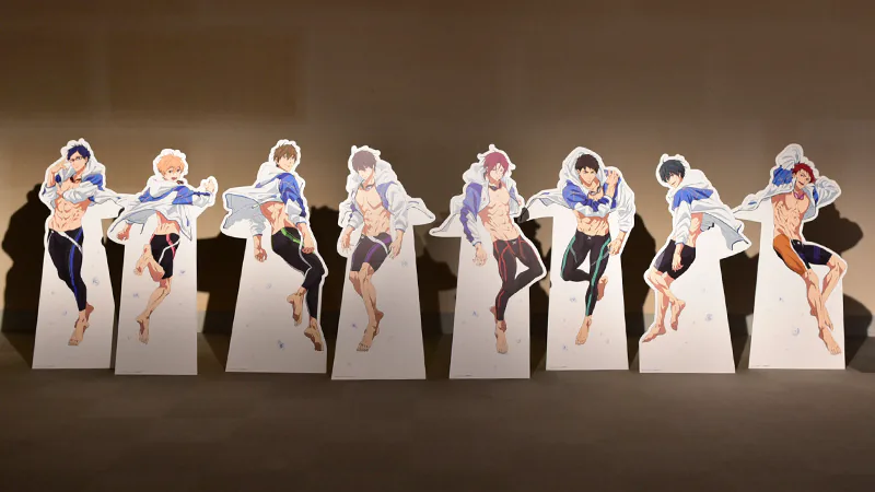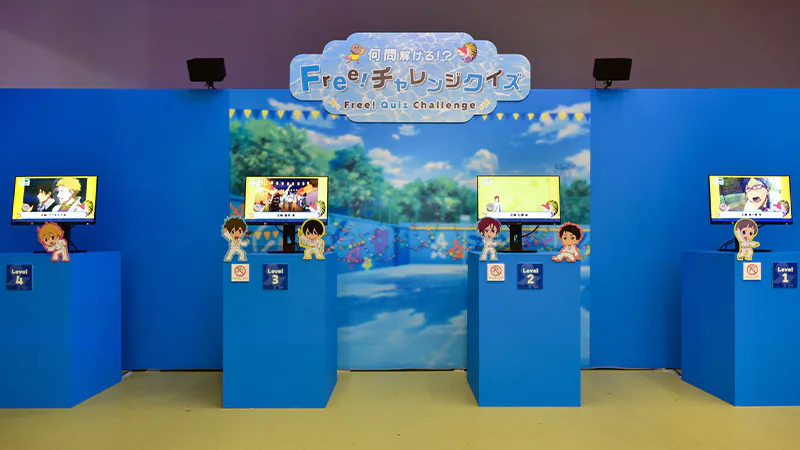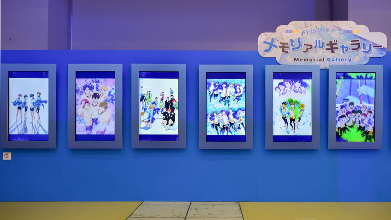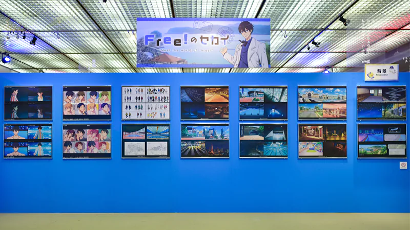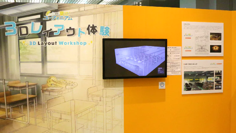 また、『Free!』シリーズからは「Free!チャレンジクイズ」や「Free!筋肉図鑑」などの楽しい展示をご用意。『響け!ユーフォニアム』シリーズからは実際に資料として使用している楽器の展示や、低音パート教室の3Dモデルをお好きな角度から鑑賞できる「3Dレイアウト体験」コーナーが設けられました。