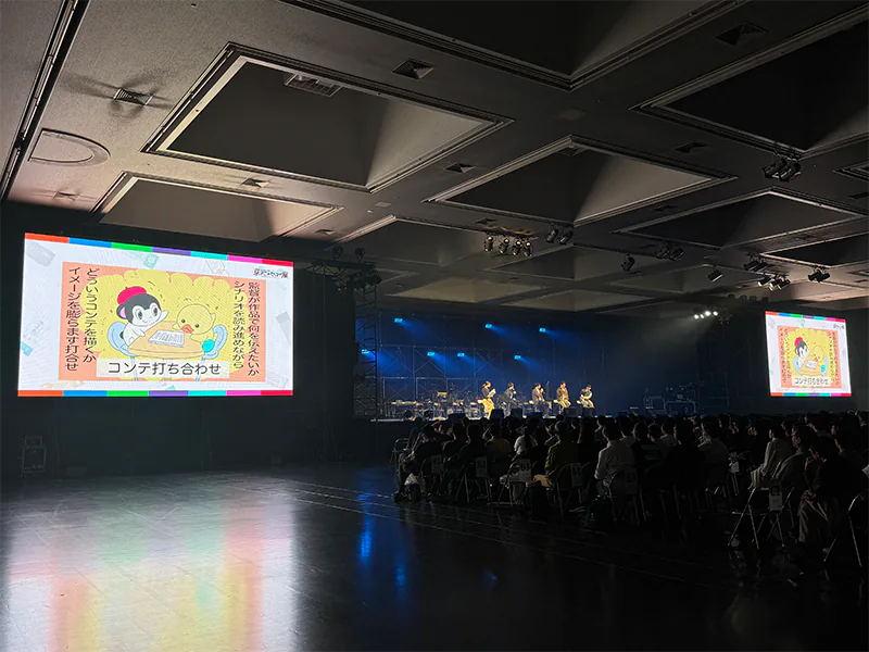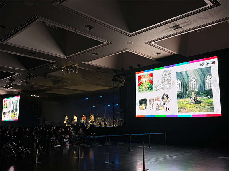 最初のステージでは京アニのクリエイター陣が各作品の制作秘話をご紹介。丸木宣明さん(作画監督)、岡村公平さん(キャラクター設定・総作画監督)、米田侑加さん(色彩設計)、笠井信吾さん(美術監督)、植田弘貴さん(撮影監督)、山本 倫さん(3D監督)の6名が、制作時のエピソードや作品に込めたこだわりを披露しました。